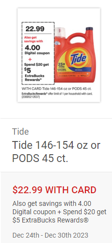 is price at $22.99 WITH CARD but you also have also get savings with 4.00 Digital coupon and when you spend $20.00 you get $5.00 ExtraBucks Rewards. Don't forget to submit your receipt to P&G Good Everyday Rewards: Earn rewards and Help others with every purchase!