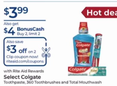 Deal; Select Colgate Toothpaste, 360 Toothbrushes and Total Mouthwash; $3.99; Also get $4.00 BonusCash Buy 2, limit 2; Get $3.00 off 2 Rite Aid Digital Coupon in your Rite Aid App