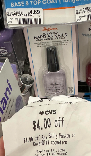 Check your CVS app and the CVS red Box (savings center) for this CVS Store $4.00 off Coupon and Score Sally Hansen Hard As Nails for just $0.69.