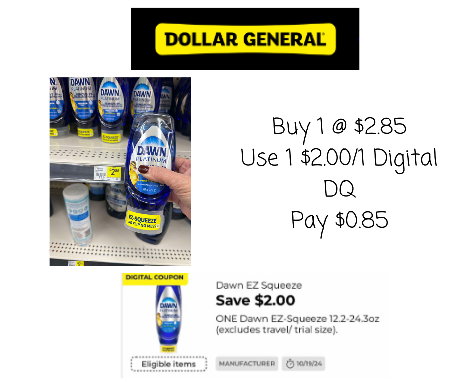 Head over to your nearest Dollar General store and pick up Dawn Platinum EZ-Squeeze Dish Soap (12.2 fl oz) between 09/29 and 10/05. Make sure to have your coupon clipped and ready to go at checkout!