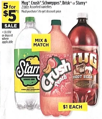 This week at Dollar General MUG, Crush, Starry, Scweppes, & Brisk 2 liter bottle will be on sale 5 for $5.00 making each bottle $1.00 each; We will be updating this post if any digital coupons come out that will lower your out of pocket cost.