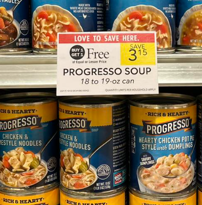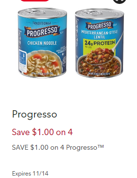 This deal can be done at Publix 10/11/2023-10/17/2023. Progresso soup is on sale BOGO from 10/11/2023-10/17/2023. Use the Save $1.00 on 4 and pay $5.30 making each can $1.32.