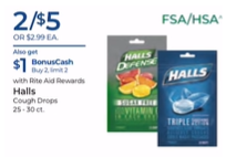 Halls Cough Drops; 25 – 30 ct.; 2/$5.00; Also $1 Bonuscash get Buy 2