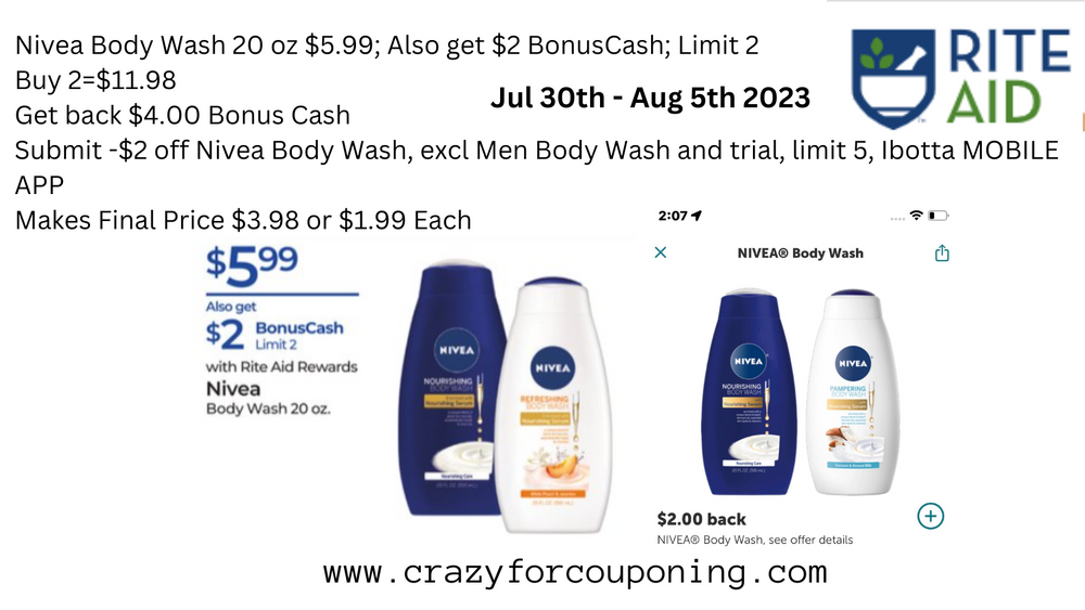 Deal; Nivea Body Wash 20 oz $5.99; Also get $2 BonusCash; Limit 2
