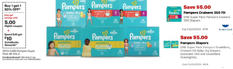 Attention all parents and caregivers! If you're looking to stock up on diapers, then you won't want to miss out on this incredible deal at CVS until 05/11. Buy one box of Pampers for $37.79 and get a second box for just $18.89, bringing your total to $56.78. But wait, it gets even better – use $10 worth of digital coupons to bring your total down to $46.78, plus receive a $10 ECB making it only $36.78! And the savings don't stop there – submit your receipt to P&G for a $5 Visa gift card, bringing your final cost down to just $31.68 or an unbelievable $15.85 per large box! Don't miss out on this amazing opportunity to save big on essential baby items – stock up now before this deal ends!