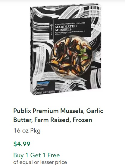 This deal can be done at Publix 03/20-03/30. Publix brings you some great BOGO deals on a regular basis. Publix Premium Mussels, Garlic Butter 16 oz Pkg at $4.99 get one free.