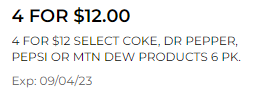 Buy 4 Dr. Pepper six packs @ 4 for $12.00