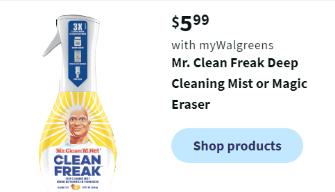 Use 1 Save $3.00 ONE Mr. Clean Clean Freak Starter Kit, Liquid 41-64oz, or larger OR Ultra Foamy Magic Eraser 3ct or larger (excludes trial/travel size) Found in your Walgreens app or online.