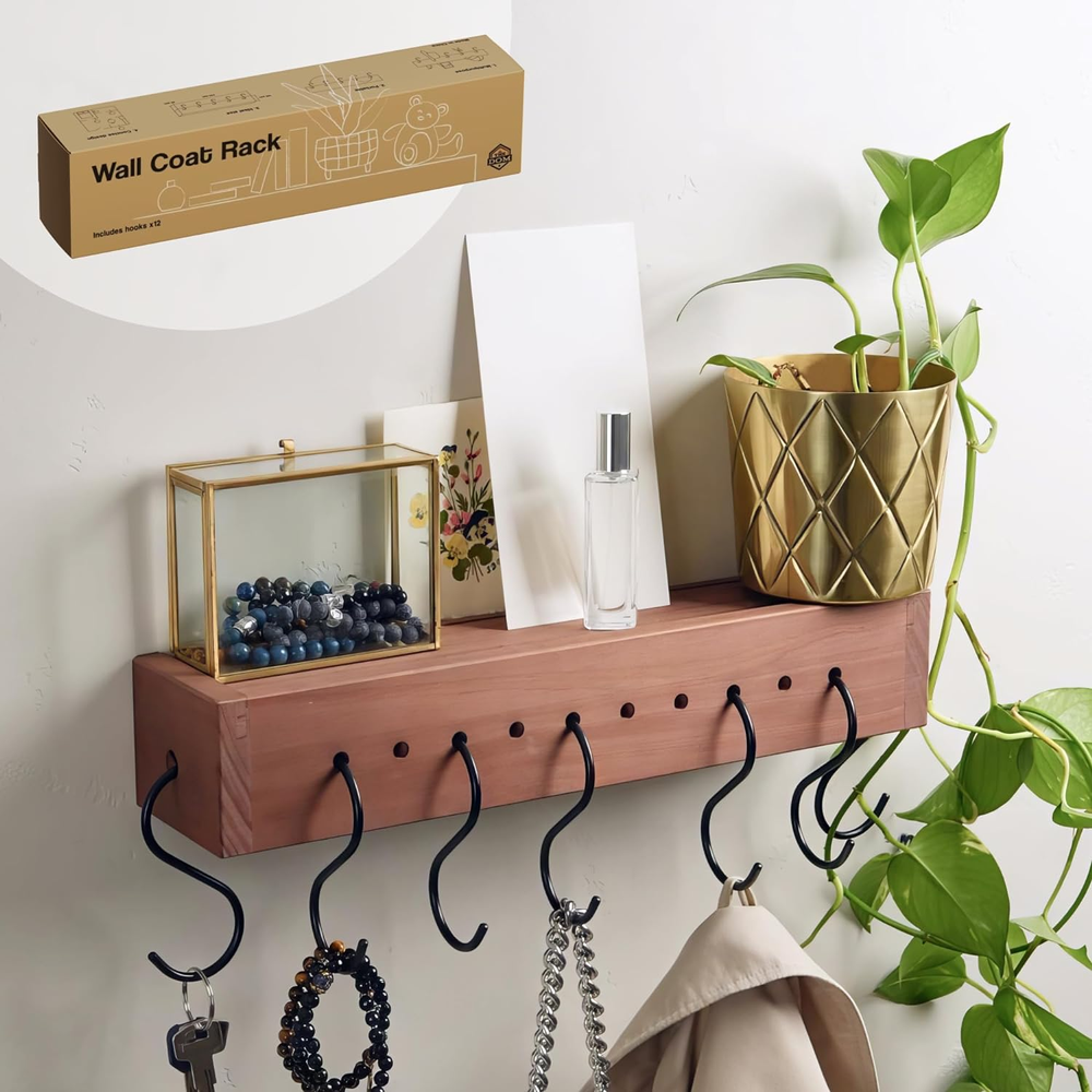 This stylish and versatile wall shelf-coat hanger from TheDOM, equipped with 12 hooks, offers a seamless blend of style and practicality for coat storage, thus enhancing the aesthetic of your decor. The number of hooks is customizable to fit your needs—ideal for hanging a few coats, keys, and more in your entryway, organizing sundries in your mudroom, or holding towels in your bathroom. It features a bumper to prevent small items from falling and a cut-out for displaying cherished memories.