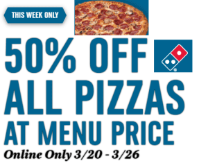 From 03/20-03/26 at Dominos Pizza you can score 50% off all your pizzas. Select this online only offer. Min. purchase