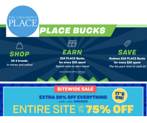 Earn $10.00 on Every $20.00 You Spend at The Children's Place until 09/11/2023. Spend more to earn more! Score an