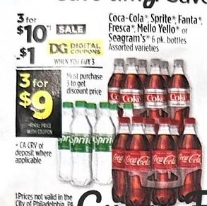 Deal; Coke, Sprite, Fanta, Fresca, Mello Yello, or Seagrams six pack bottles 3 for $10.00