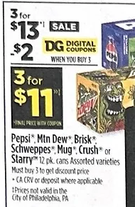 Dollar General has select Pepsi, Brisk, Schweppes, Mountain Dew, MUG, CRUSH, & Stary-12 Pack 12-packs on sale 3/$13.00. Clip the $2.00 off 3 soda 12-pack digital coupon and THREE 12-packs for only $11.00 – just $3.66 each!