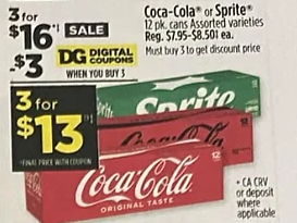 September 22, 2024-September 28, 2024 Dollar General has select Coca-Cola, Sprite, 12-packs on sale 3/$16. Clip the $3.00 off 3 soda 12-pack digital coupon and THREE 12-packs for only $13 – just $4.33 each!