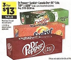 3 for $13.00 Dr Pepper* Sunkist, Canada Dry RC* Cola. 7UP* or A&W* 12 pk. Cans Assorted varieties; Making each pack $4.33. We will update if a coupon becomes available.