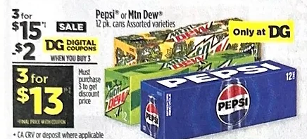 Dollar General has select Mountain Dew & Pepsi, 12-packs on sale 3/$15. Clip the $2.00 off 3 soda 12-pack digital coupon and THREE 12-packs for only $13 – just $4.33 each!