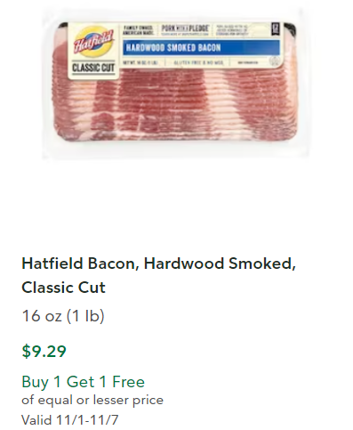 Buy 1 Hatfield Bacon @ $9.29 Get 1 Free Making each pack $4.64