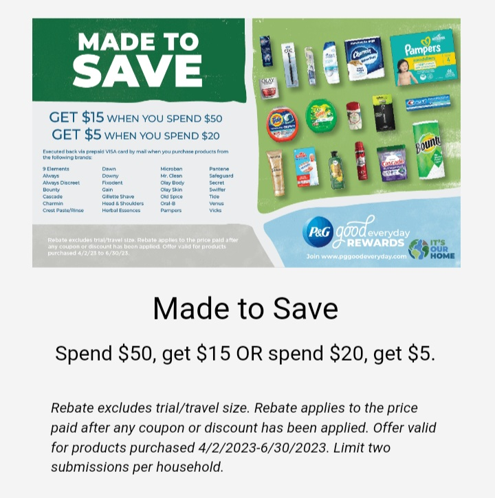 Submit to: https://www.pggoodeveryday.com/rebates/ Made to Save Rebate for a prepaid $5 Visa when you spend $20 on participating products listed below: