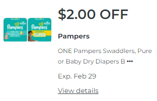 Use 1 Save $2.00 OFF ONE Pampers Swaddlers, Pure or Baby Dry Diapers Bag (excludes trial/travel size). RITE AID DIGITAL COUPON