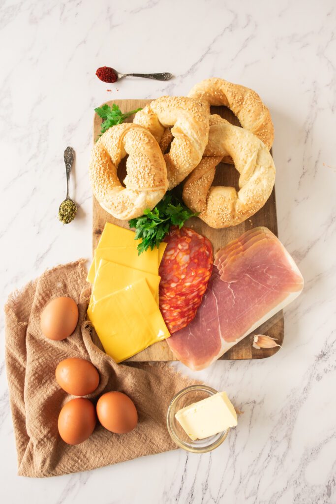 For this recipe, you’ll need fresh bagels, eggs, cheddar cheese, prosciutto, and Italian salami to create a deliciously layered breakfast. The garlic butter, made with salted butter, fresh garlic, parsley, oregano, and chili paprika, adds depth and enhances the flavors. A pinch of salt ties everything together, making each bite rich and satisfying.