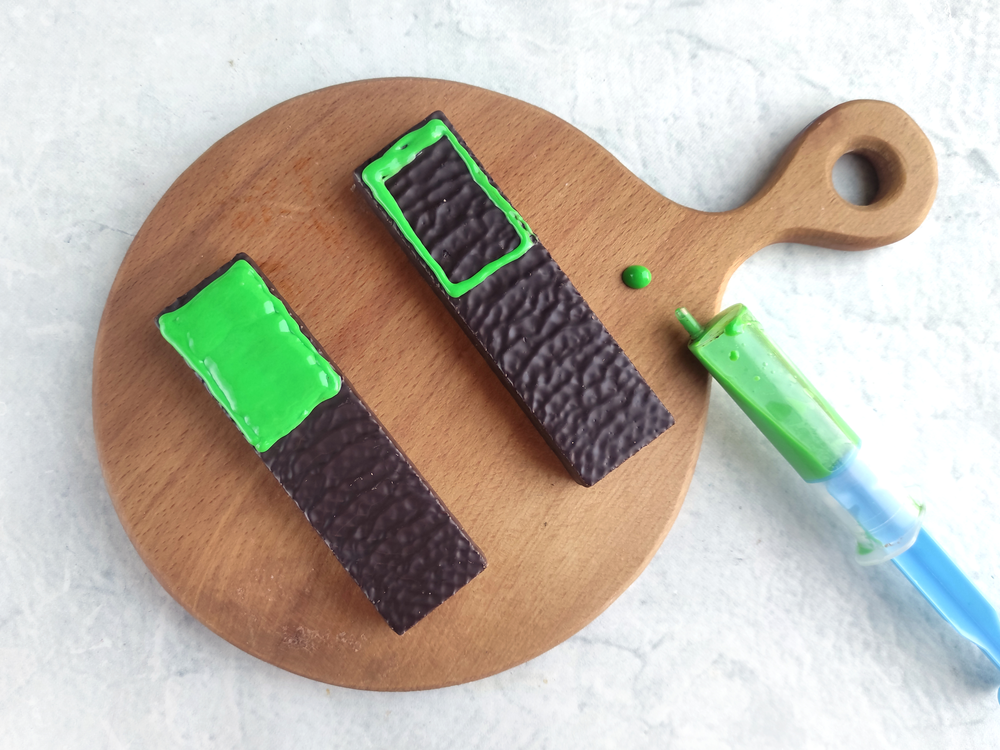 1. Remove the wrapping from the bars and place them on a board. Place the white chocolate in a bowl and melt in the microwave by pulsing for 20 seconds. Depending on the power of your microwave you will need 2-3 servings. Add the food coloring and mix the mixture until smooth. If the mixture is thick, you can add a little coconut oil. spoon into the syringe.