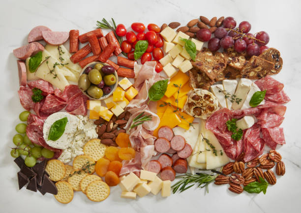 – Use a variety of colors and textures in your board. Think about incorporating fruits, vegetables, meats, cheeses, and grains.