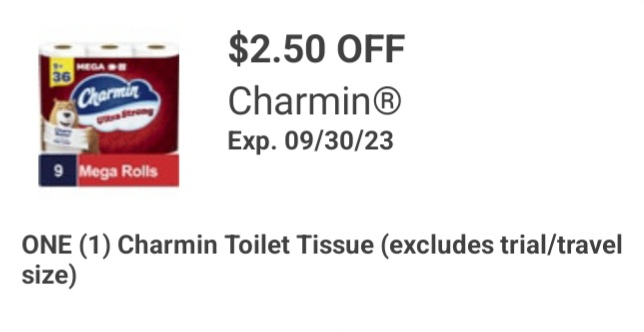 Use – $2.50 off ONE Charmin Toilet Tissue (excludes trial), myW DMC, ex. 09/30