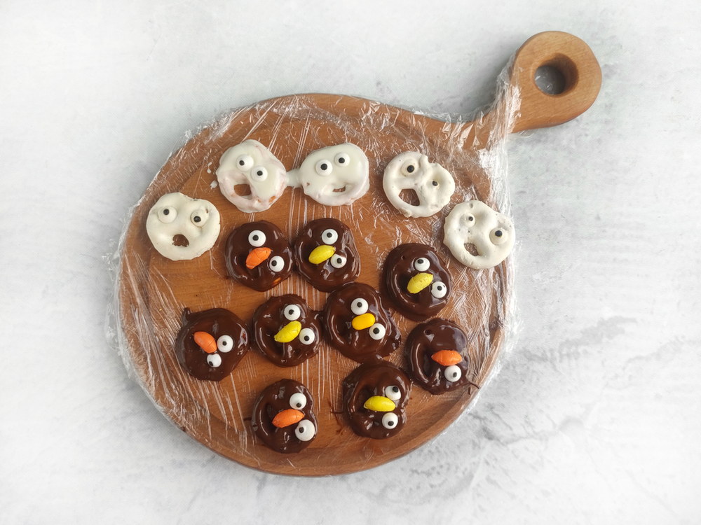 Melt 1/3 of the white chocolate in a similar fashion. Dip the pretzels in it one by one, lay them out on a board and decorate them with eyes. We got spooky ghosts.