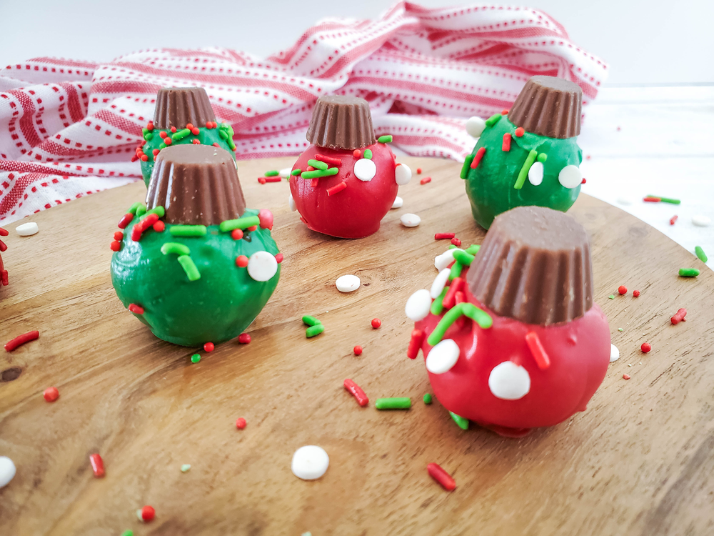 Remove the OREO balls from the freezer, and dip them into the melted candy. Set on a parchment lines tray. Add a Reese’s to the top, and a bit of sprinkles.