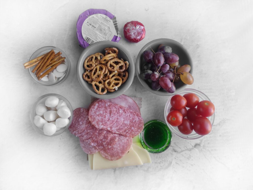 - Place dark grapes on one side of the salami garland and mini mozzarella on the other. lay out the pretzels. Fill in the empty areas with light colored grapes, chocolate, and tomatoes so that you get a Christmas tree. Decorate the Christmas tree with snowflakes and sprinkle some salt instead of snow.