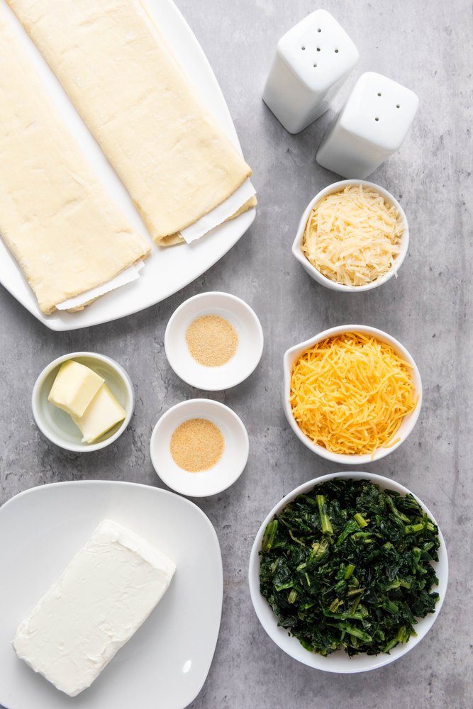 The spinach dip filling typically consists of chopped spinach, cream cheese, sour cream, Parmesan cheese, garlic powder, and various seasonings for an extra kick. When encased in layers of delicate puff pastry and baked to perfection, it creates a savory appetizer or snack perfect for any holiday gathering.