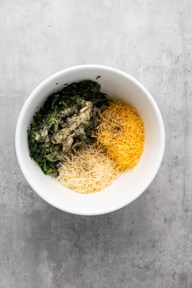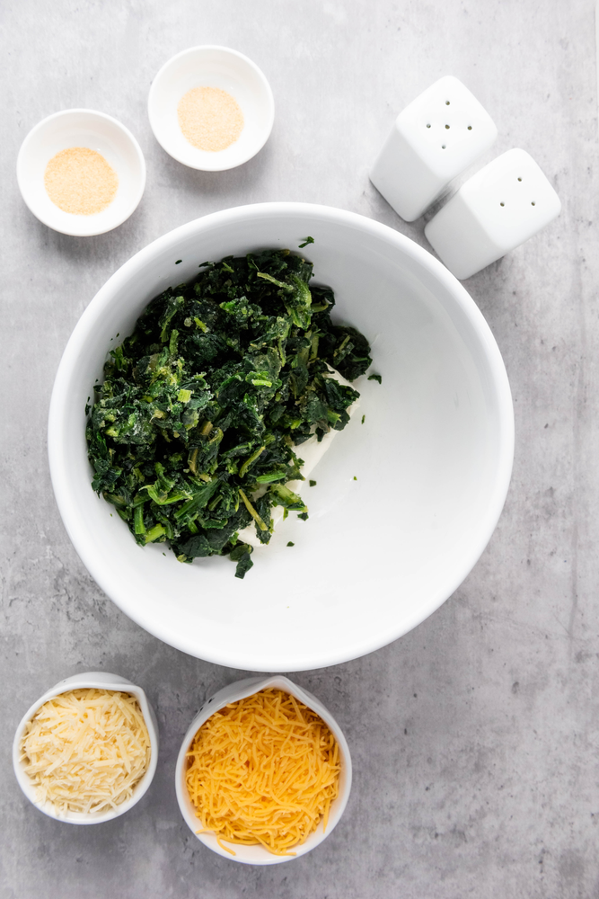 In a medium mixing bowl, combine the spinach, cream cheese, mozzarella, Parmesan, garlic powder, onion powder, salt, and pepper. Mix until well blended.