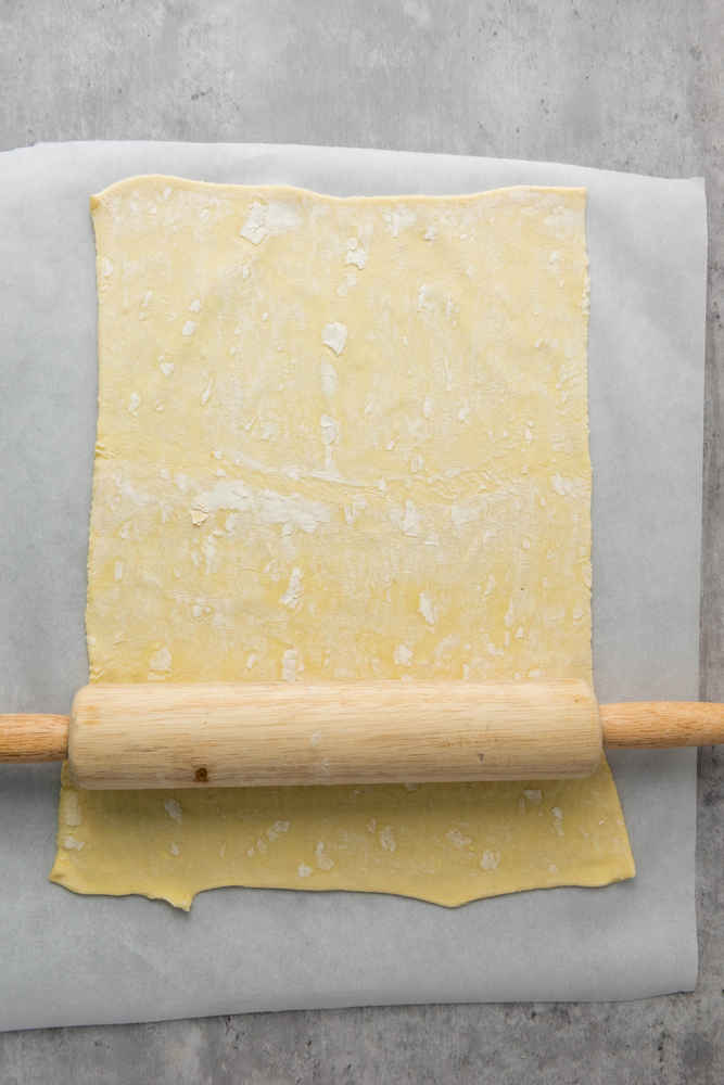 Roll out the second puff pastry sheet and place it over the spinach dip-covered triangle. Trim the edges to match the shape of the bottom triangle.