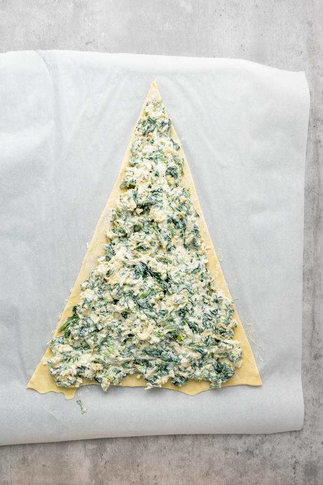Spread the spinach dip evenly over the puff pastry triangle.