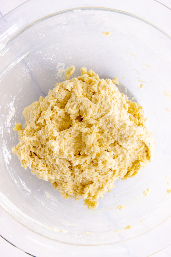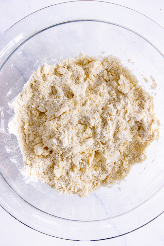 • Add cold and diced butter in the middle and smush butter and flour together, making a crumbly mixture.