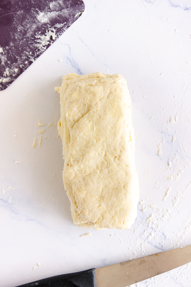 • Fold the dough in half and cut it in half width way and put the those 2 piece on top of each other.