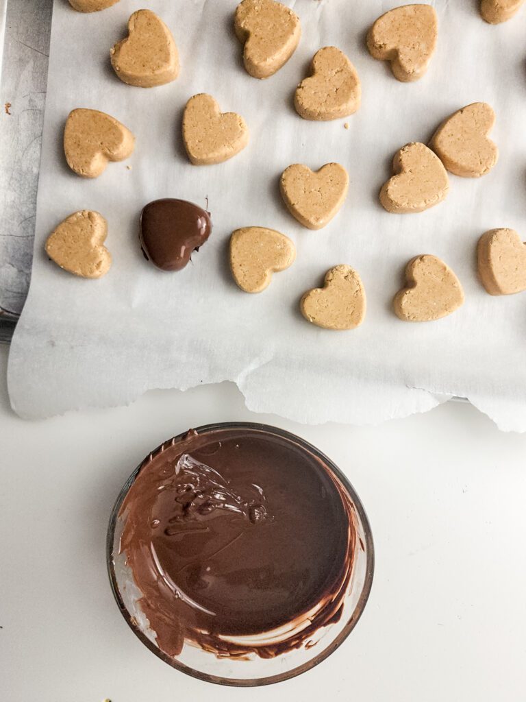 Next, shape the peanut butter mixture into small hearts using a cookie cutter or your hands. Aim for about one inch thick. Place these hearts on a parchment-lined baking sheet, and once you’ve shaped them all, pop the sheet into the freezer for about 30 minutes. This helps them firm up nicely.