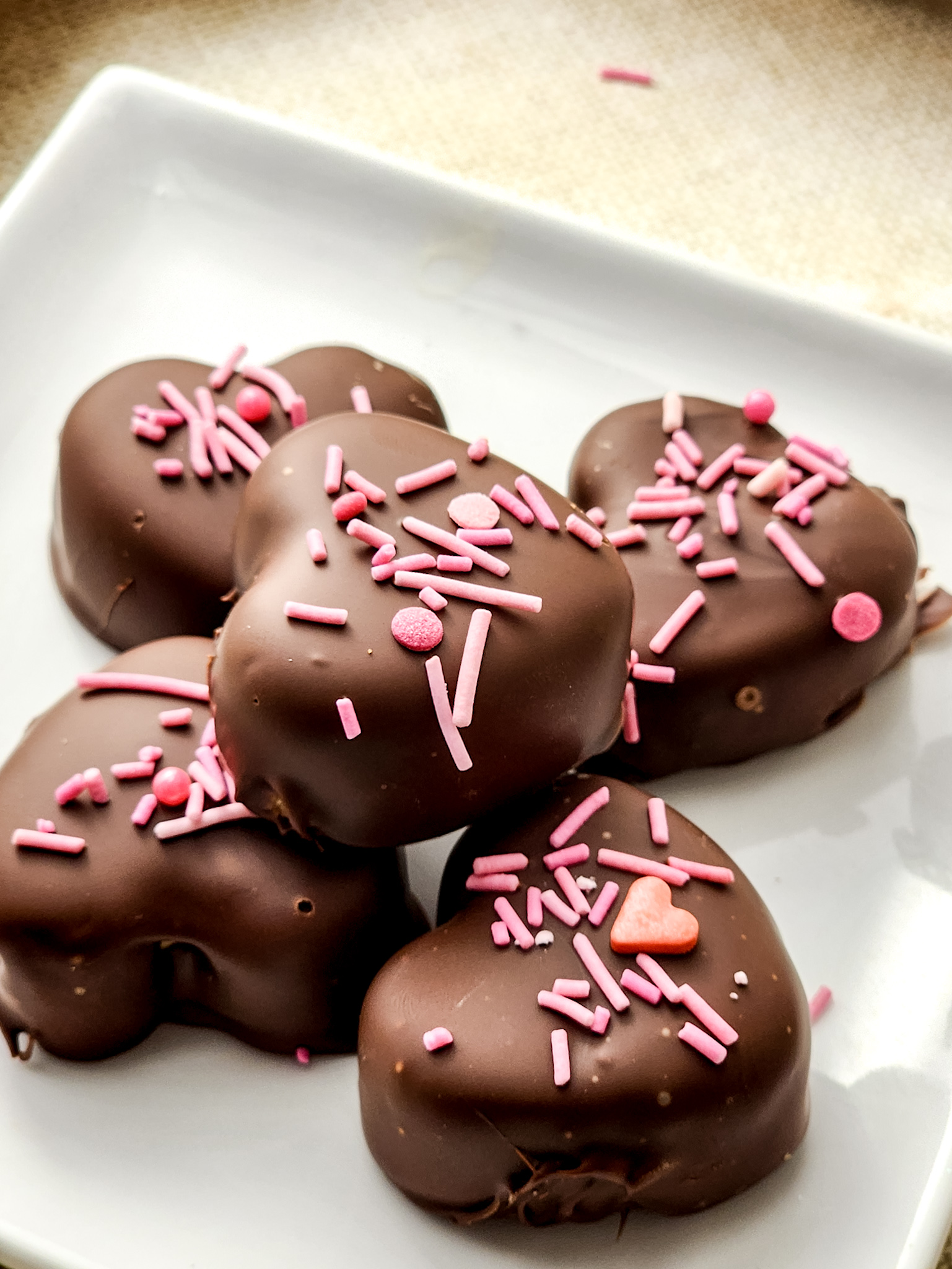 - Prep an are with the peanut butter hearts, melted chocolate, sprinkles and a baking sheet covered with parchment paper.