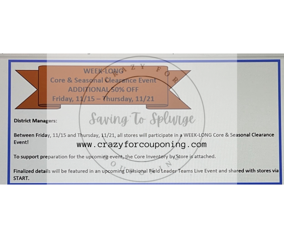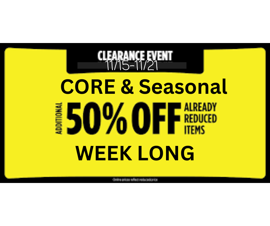 CORE CLEARANCE; CORE clearance is everyday items. These are the everyday items that are included in the store like the shampoos, diapers, and such. These items are normally located in the clearance sections but a lot of times can be found throughout the store in their designated spot. Some of these items are only priced at 10% off the regular price to start the clearance process but during these events they are an extra 50% off. During the CORE clearance all CORE items already starting the clearance cycle will be an extra 50% off.