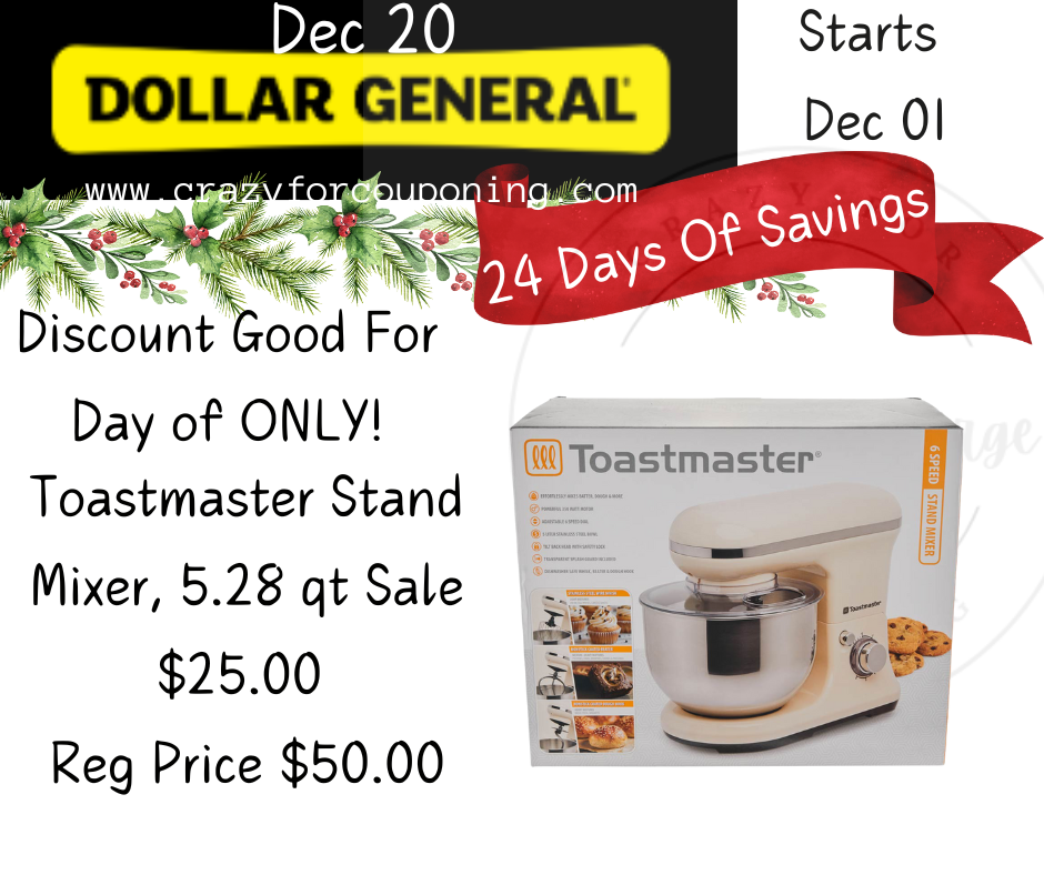 Friday, December 20- Toastmaster Stand Mixer, 5.28 qt Sale $25.00 Reg Price $50.00