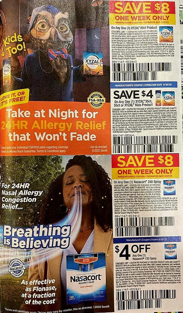 On 05/21/2023 you can expect two inserts in your Sunday papers. Remember that this list is a preview of what could be, each region can get differing coupons and different values. If you are looking for information on ordering coupons please contact Kristi Phillips our coupon supplier here by sending her a private message.