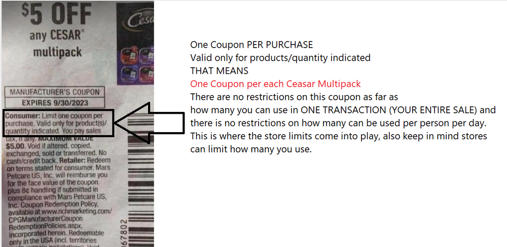 Each coupon tells you everything that you need to know to use that coupon such as what product to buy, how many, and then there is the fine print. The fine print is where you find your terms of service per say. So what is it, transaction, trip, purchase,? What does it all mean.