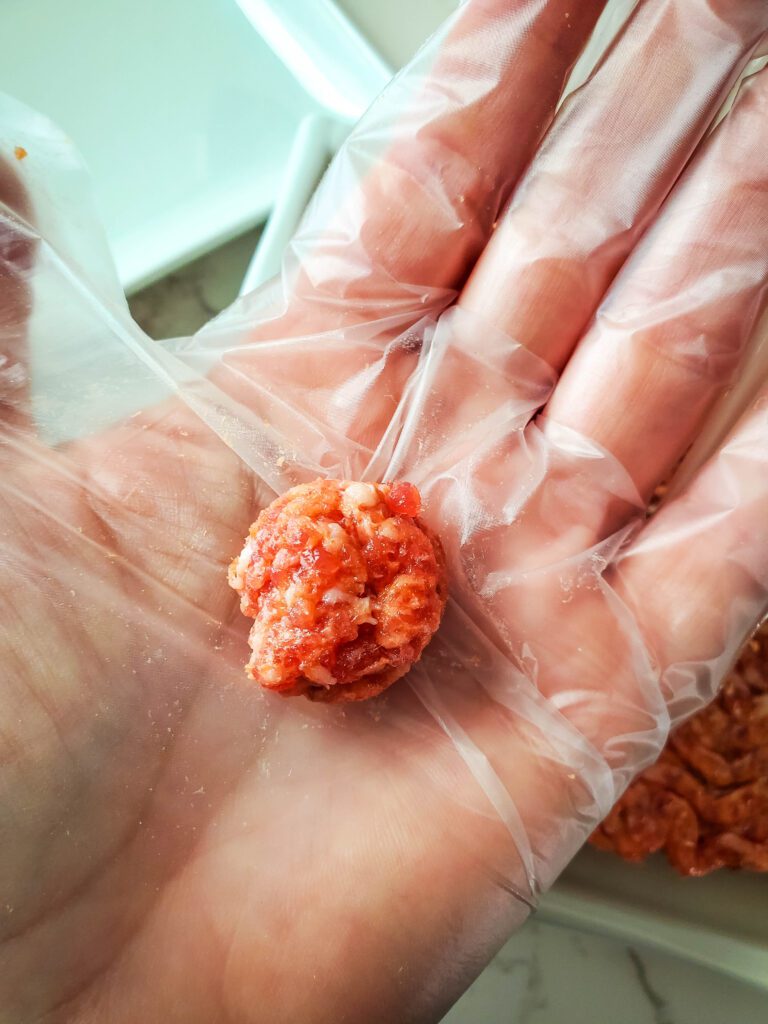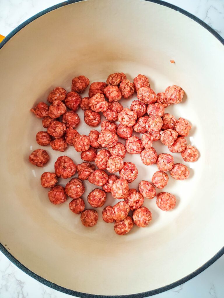 Form the sausage into small balls (¼–½ inch) and brown them in a large Dutch oven over medium heat until cooked through.