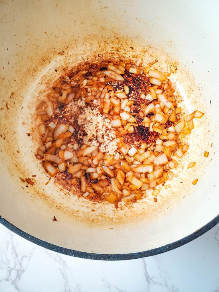 2. Sauté onion for 5 minutes. Add garlic and cook 1 minute.