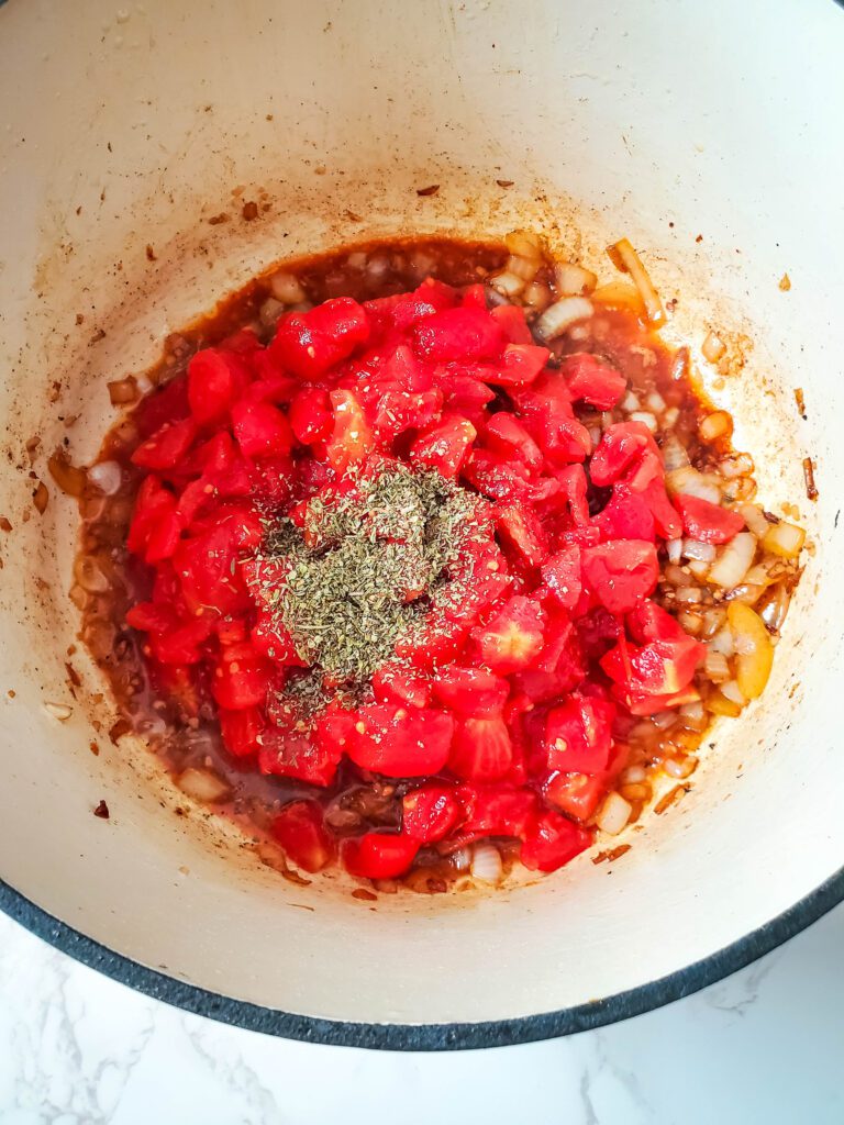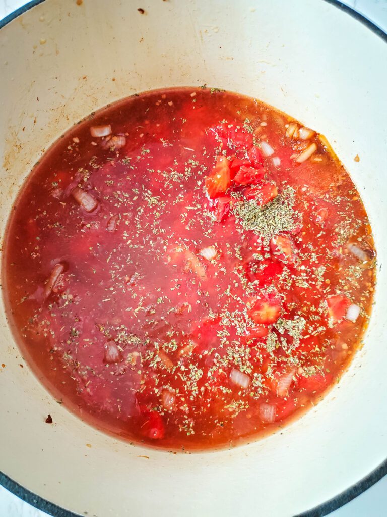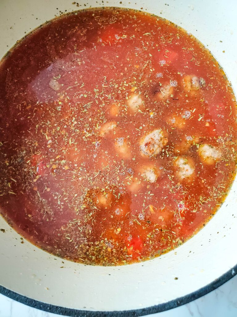 3. Add sausage, tomatoes, Italian seasoning, and broth. Bring to a boil.