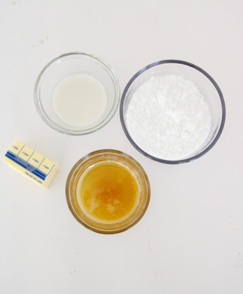 - Melt butter powdered sugar, honey and almond milk in a small saucepan over low heat. Continue to stir the glaze until all sugar is dissolved. Do not let boil and burn