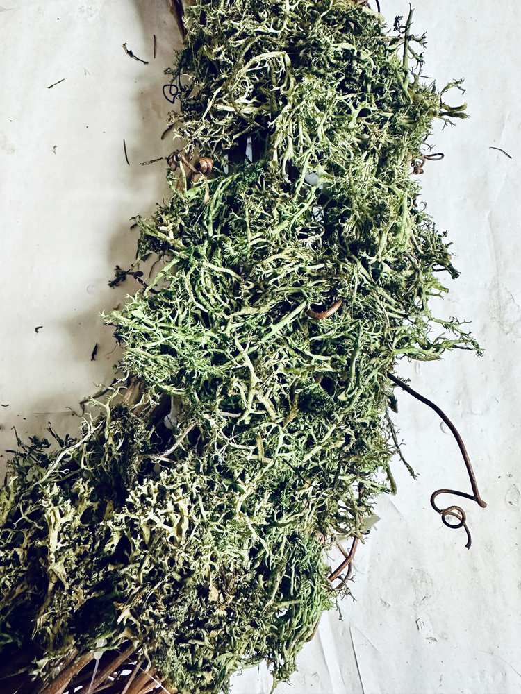 Start by adding moss to almost the entire grapevine wreath. I left a spot open on the top as I was adding a bow.