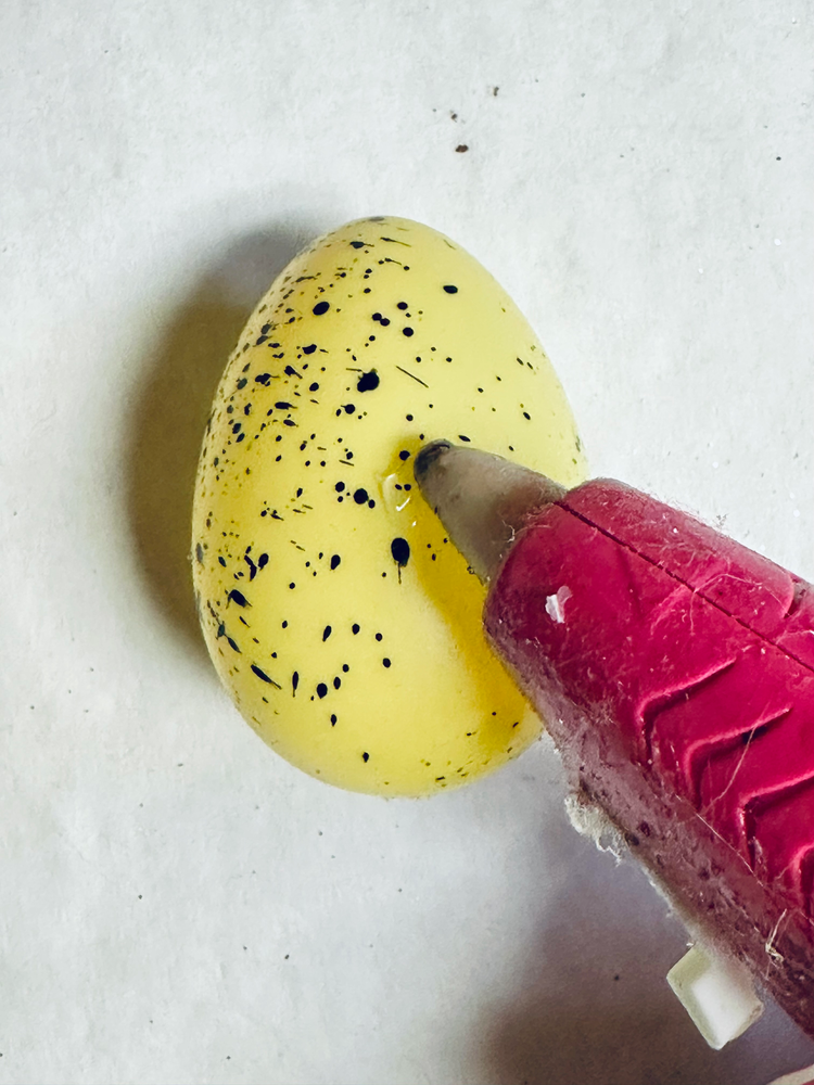 To add the easter egg sign, remove the piece of jute on the top (don’t throw it away you will reuse this. I pushed the bottom section of the sign into some of the grapevines and it held it, I added some hot glue to secure it.