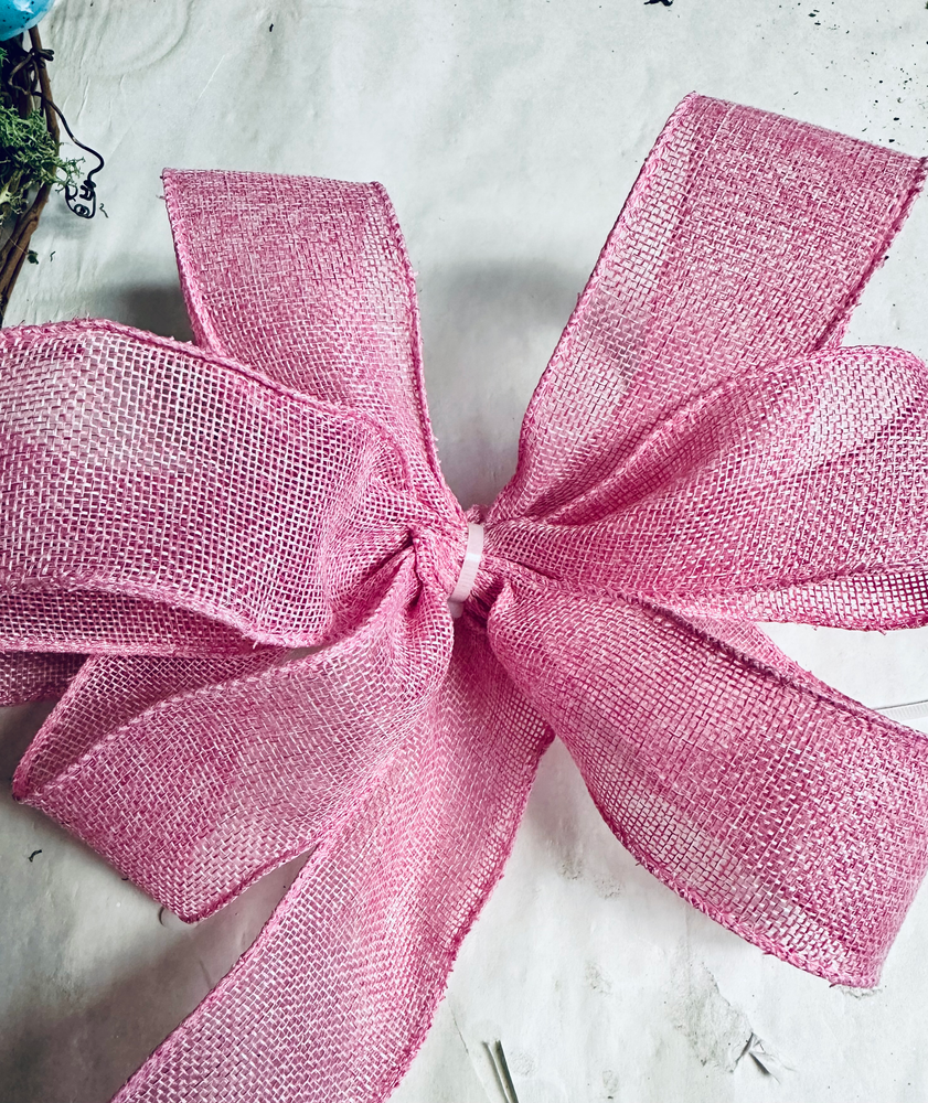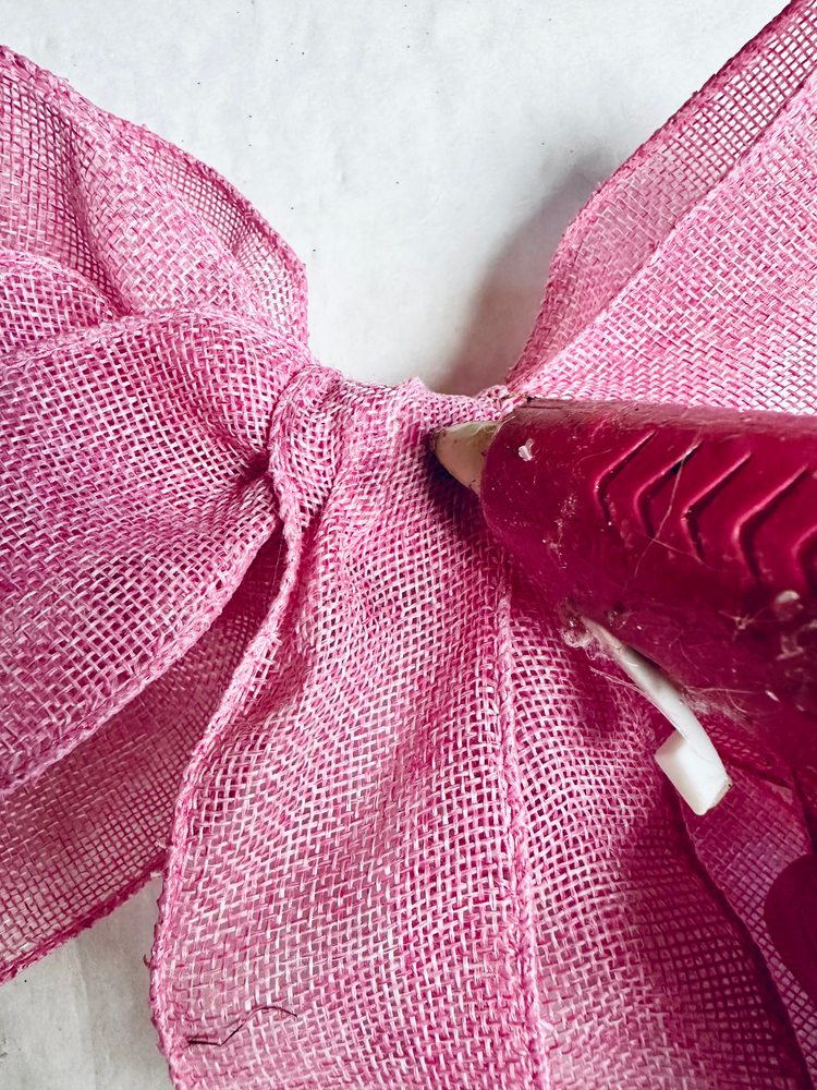 Next I made a bow using the burlap ribbon, make sure your ribbon is wired, it is much easier to work with. I made a few loops and secured them together with a zip tie. I then cut another piece of the burlap ribbon to make the tails and to use to wrap over the zip tie to cover it. Add a dab of hot glue on the center of the bow to secure the burlap ribbon. Cut the tails to your desired length.