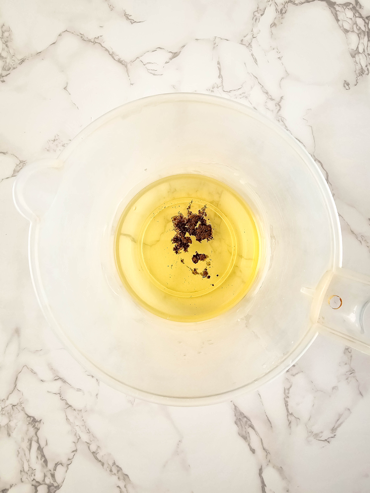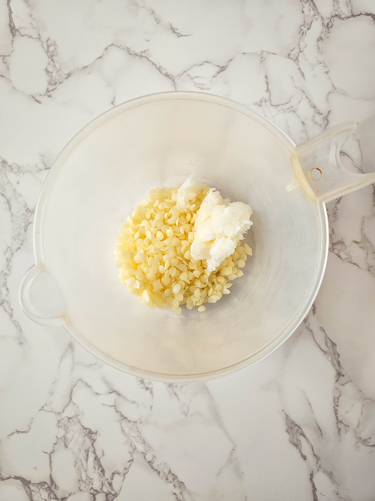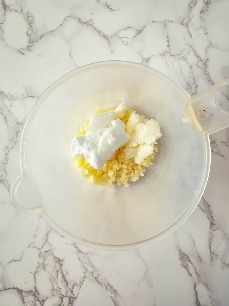 Add the shea butter, coconut oil, and beeswax to the measuring cup, and heat in 30 second intervals, stirring between each heating session, until fully melted.